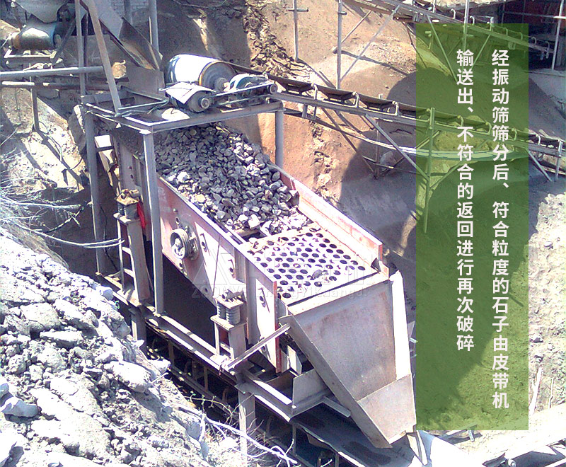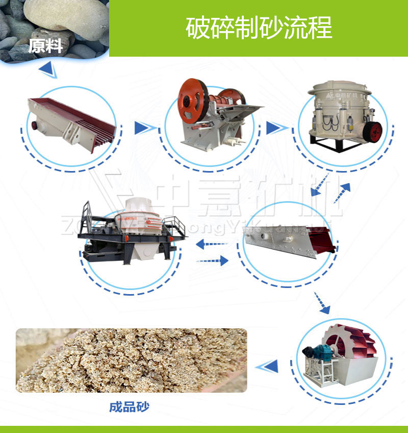 石料從山上爆破下來,通過自卸車將小于400mm的石料送入振動(dòng)給料機(jī),振動(dòng)給料機(jī)把石料均勻的送入顎式破碎機(jī),顎式破碎機(jī)對(duì)石料進(jìn)行段破碎,從顎破出來的石料在70mm以下,再通過皮帶機(jī)輸送至反擊破進(jìn)行二級(jí)破碎,破碎后的物料由皮帶機(jī)輸送至制砂機(jī)進(jìn)行細(xì)碎(注:原礦在40mm以下可直接由制砂機(jī)進(jìn)行細(xì)碎),細(xì)碎后的物料再通過圓振篩進(jìn)行粗砂、中砂、細(xì)砂等規(guī)格的篩分。對(duì)于砂子含粉量要求嚴(yán)格的可在細(xì)砂后面加配洗砂機(jī),洗砂機(jī)排放的污水可再經(jīng)細(xì)砂回收機(jī)進(jìn)行回收,一方面減少環(huán)境污染,另一方面可提高制砂產(chǎn)量。